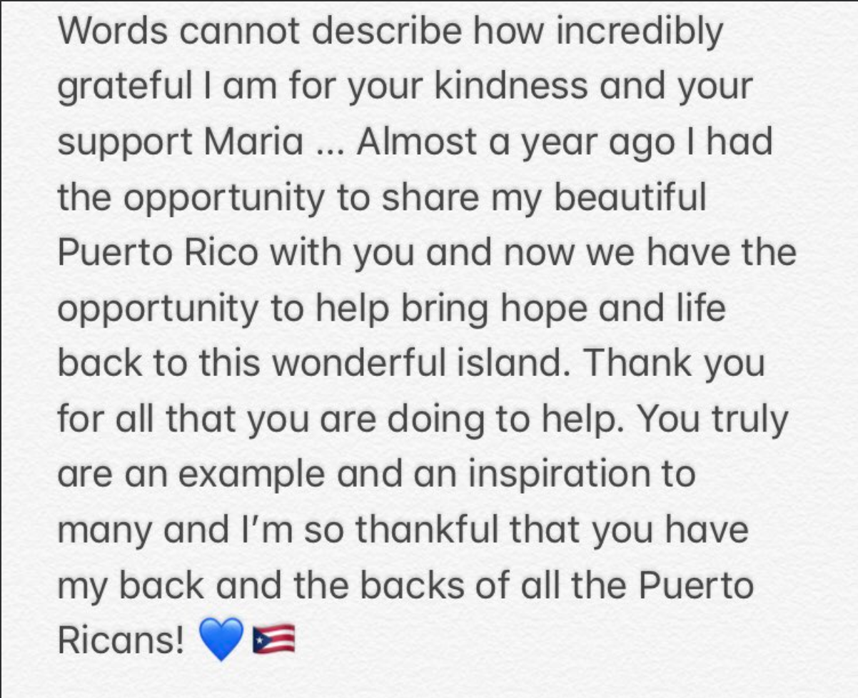 “Meno di 12 mesi fa ho visitato la splendida isola di Porto Rico come ospite di Monica Puig per un match d’esibizione. Mi sono innamorata dell’isola, della sua gente e della sua cultura. Adesso è davvero triste sapere in che condizioni è l’isola e quanto la gente sta soffrendo. Ho seguito con attenzione tutto quanto di buono sta facendo Monica per la sua isola e voglio continuare ad aiutarla e supportarla con donazioni. Ho deciso quindi che tutti i profitti da oggi fino alla fine del 2017 di Sugarpova.com saranno destinati direttamente alla raccolta fondi di Monica. Al momento ha raggiunto circa 100mila dollari e certamente alzeremo questa cifra tutti insieme. Per favore, entra in http://www.youcaring.com/donatewithmonica per tutte le informazioni sulla raccolta fondi di Monica e anche nel sito Sugarpova.com. I