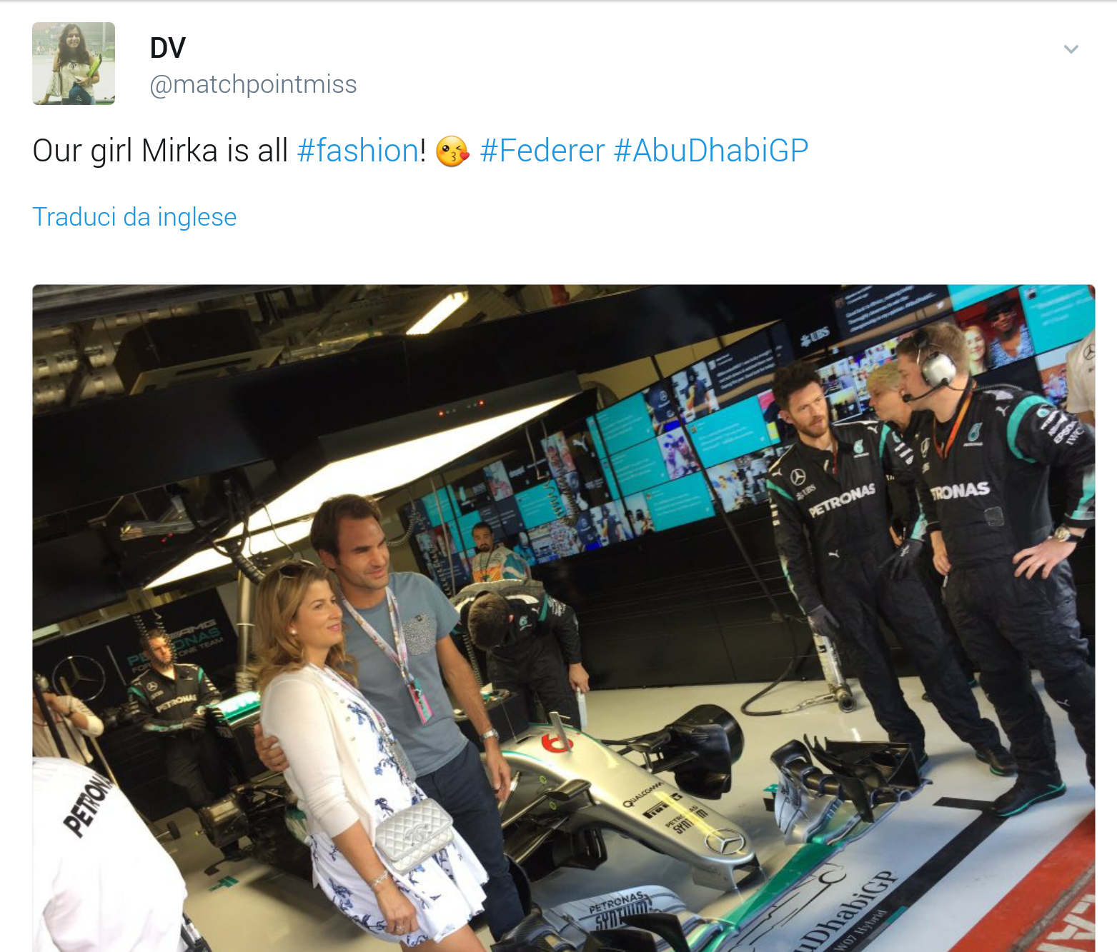 Roger Federer ha sempre dimostrato di amare lo sport presenziando alle partite della sua squadra di calcio del cuore e non solo. Oggi il campione svizzero, accompagnato dalla moglie Mirka, si trova ad Abu Dhabi dove andrà in scena la gara decisiva del mondiale di Formula 1 che consegnerà il titolo iridato a uno tra Rosberg ed Hamilton.