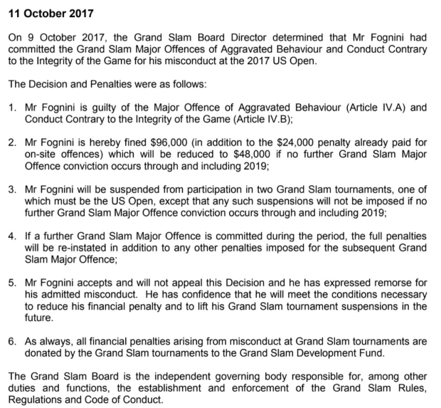 Per quanto riguarda la partecipazione nei prossimi Slam, Fabio non verrà squalificato, a meno che non commetterà un’altra grave infrazione negli Slam fino al dicembre 2019: se ciò avverrà, gli sarà vietata la partecipazione in due Slam, uno dei quali sarà obbligatoriamente gli Us Open.