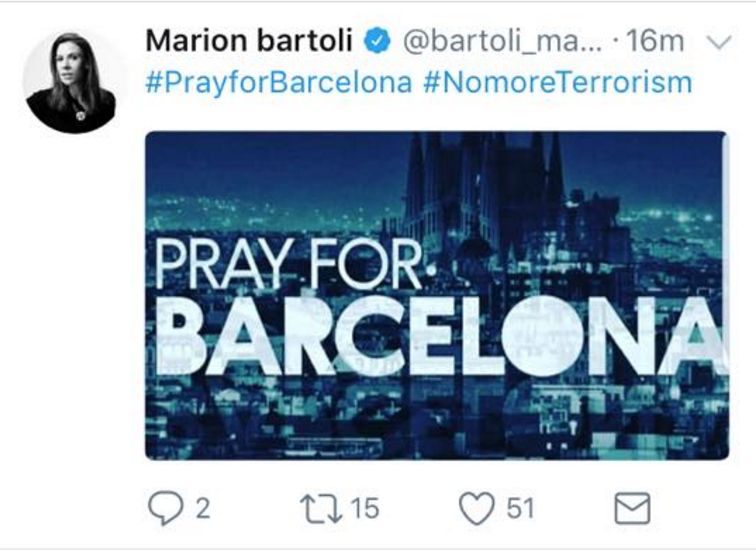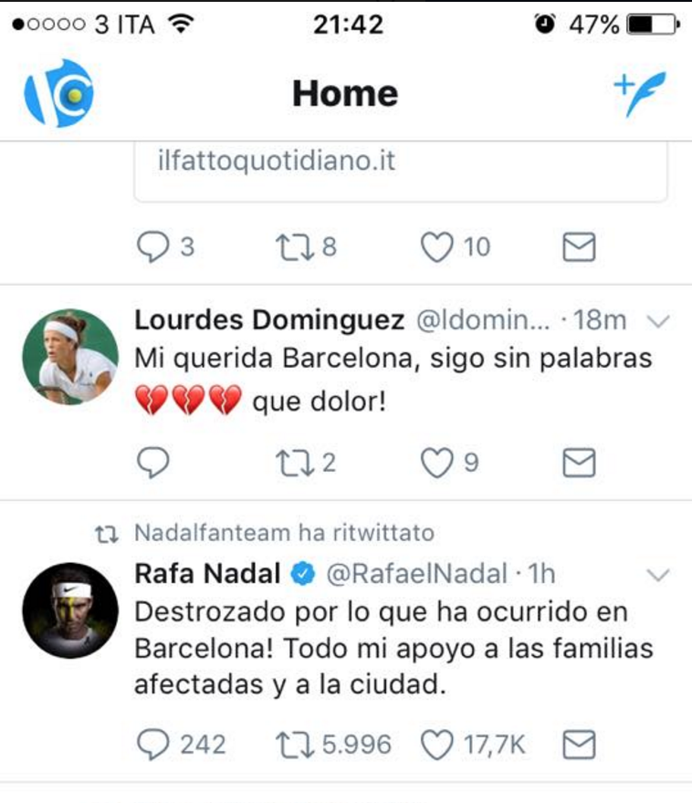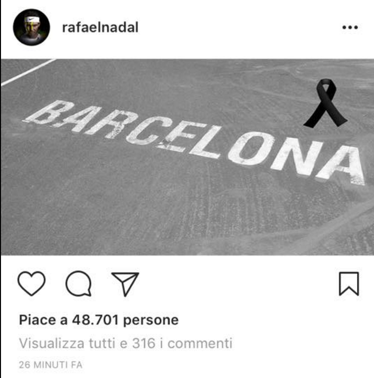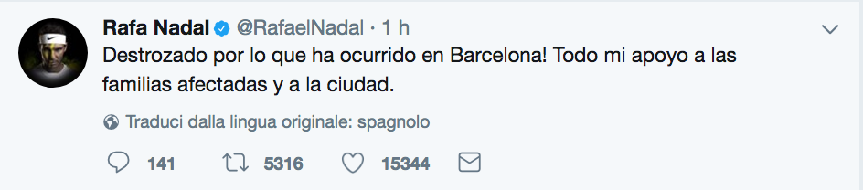 Rafael Nadal, Marion Bartoli, ma anche Fabio Fognini: dopo il tragico attentato odierno nel cuore di Barcellona, che al momento ha causato almeno 13 vittime, i campioni esprimono la loro vicinanza tramite i social.
