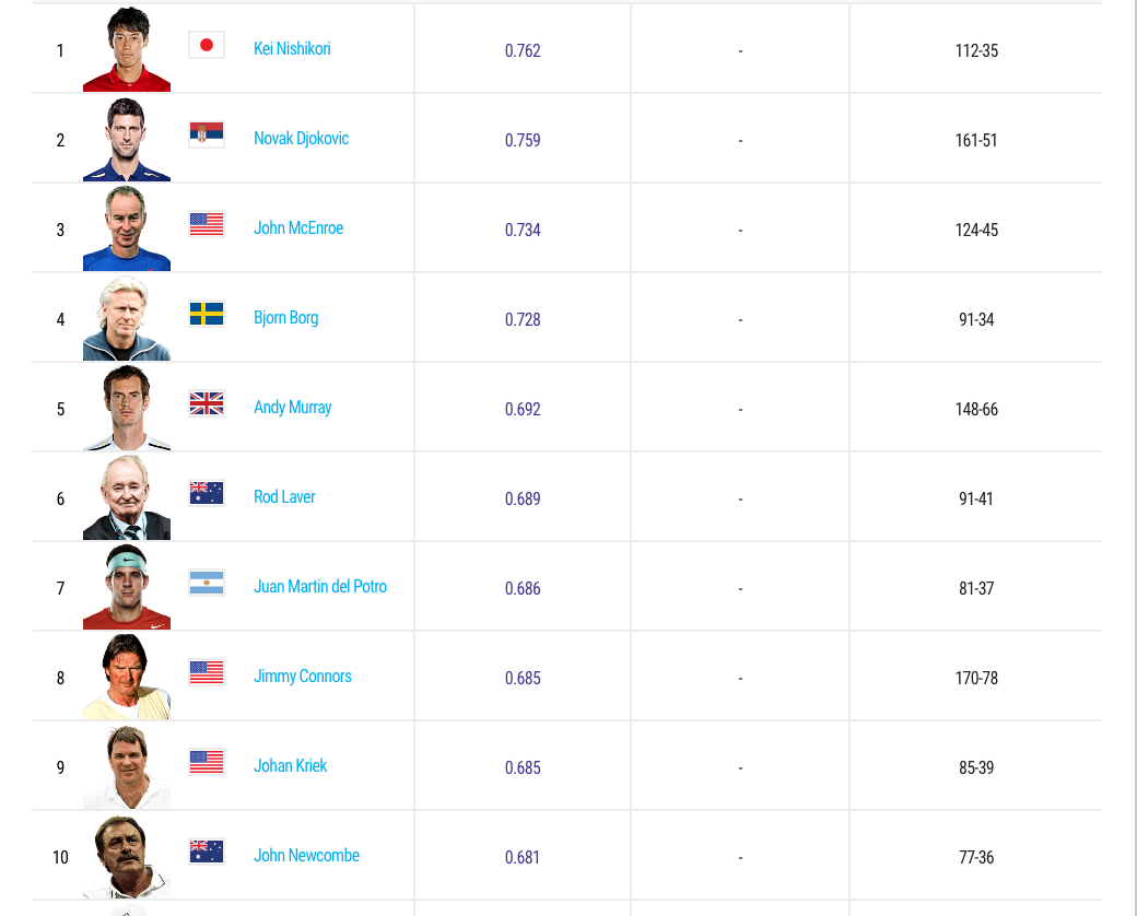 Al primo posto di questa speciale classifica troviamo sorprendentemente il tanto talentuoso quanto sfortunato nipponico Kei Nishikori, che vanta un’impressionante percentuale di vittoria del 76,7%, con solo 34 sconfitte a fronte di ben 112 successi. Subito dietro, questa volta senza nessuna sorpresa, troviamo il mago del quinto set, Robonole Novak Djokovic, colui che ha costruito i propri successi sulla solidità mentale prima che fisica: il serbo vanta una percentuale di poco inferiore, pari al 75,9%, con ben 161 vittorie e 51 sconfitte. Segue John McEnroe, il quale, a dispetto della sua tendenza a perdere facilmente la calma, ha dimostrato molto chiaramente di essere in grado di far ricorso al sangue freddo quando si trattava di chiudere le partite, raggiungendo una percentuale di vittorie al set decisivo pari al 73,4%. Al quarto posto si piazza un altro giocatore ben noto per la sua capacità di controllare le emozioni, capacità che risulta spesso determinante quando si affronta il deciding set, ovvero lo Svedese dagli occhi di ghiaccio, Bjorn Borg, il quale può far sfoggio di un ottimo storico in tal senso, dal momento che ha avuto la meglio in 91 dei 123 set decisivi giocati in carriera, con una percentuale del 72,8%. Al quinto posto troviamo Andy Murray, anch’egli molto abile a far valere il proprio blasone per uscire vincitore dalle battaglie del set decisivo nel 69,2% dei casi. Seguono l’uomo del grande Slam, Rod Laver, il quale vanta il 68,9% di vittorie, il gigante di Tandil Juan Martin Del Potro (68,6%) e Jimbo Jimmy Connors, col 68,5% di successi. Chiudono la top ten il sorprendente Johan Kriek, tennista sudafricano naturalizzato statunitense, probabilmente sconosciuto ai più, ma due volte vincitore degli Open d’Australia (1981-1982), e l’australiano John Newcombe, che segna la soglia di accesso alla top ten sulla percentuale del 68,1 %.