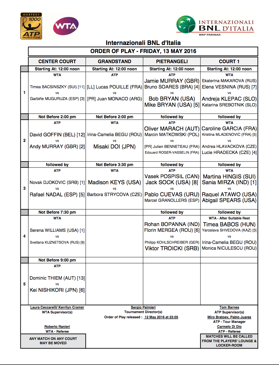 PIETRANGELI – Giornata di doppi sul Pietrangeli dove apriranno i giochi Jamie Murray e Bruno Soares contro i fratelli Bryan, a seguire Marach e Matwoski contro Bennetau e Roger Vasselin, Pospisil/Sock contro Cuevas/Granollers e Bopanna/Mergea contro Kohlschreiber/Troicki.