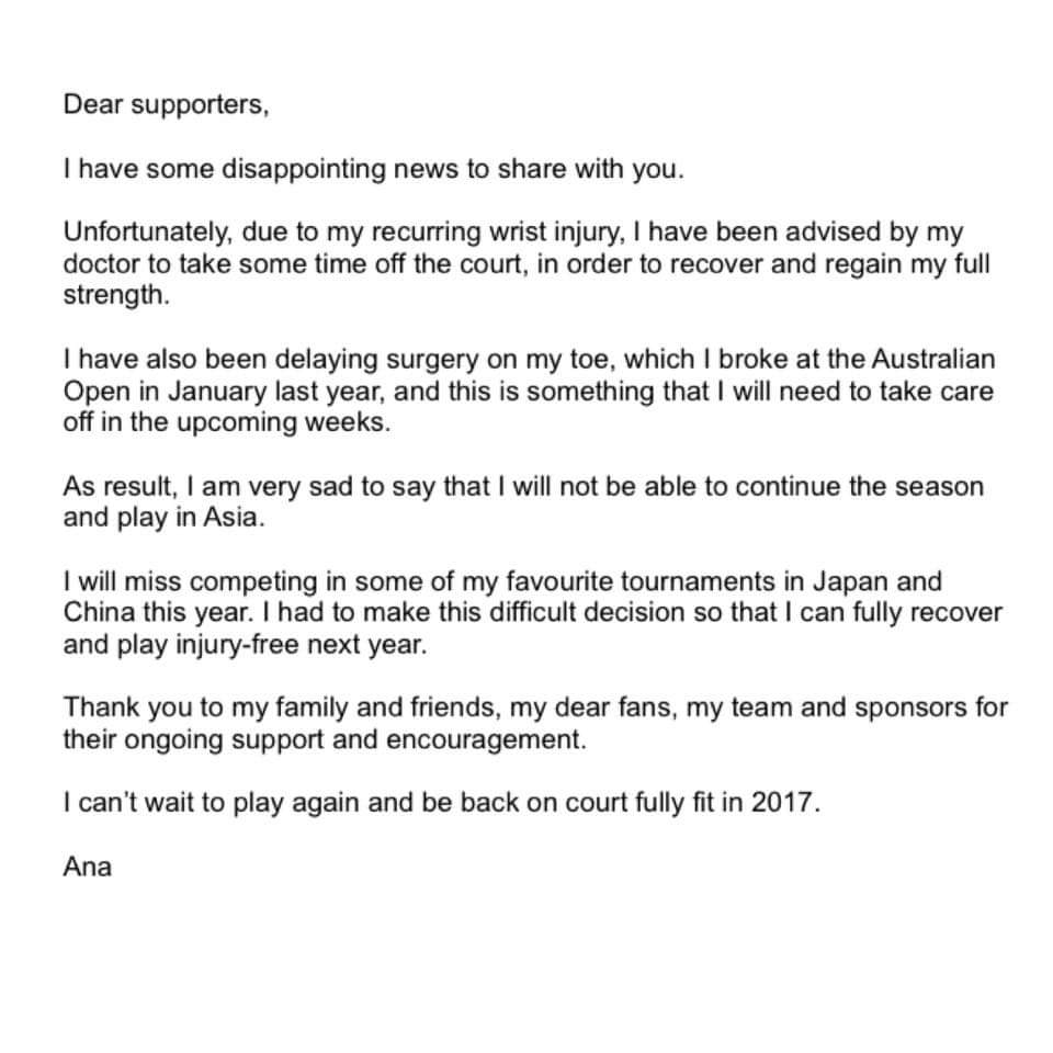 “Ho una triste notizia da condividere con voi. Sfortunatamente, a causa del ricorrente problema al polso, il mio dottore mi ha consigliato di prendermi una pausa dal terreno di gioco in modo da recuperare completamente. Avevo anche posticipato l’operazione al dito che mi sono rotta agli Australian Open lo scorso anno ed ho intenzione di sottopormi all’intervento nelle prossime settimane.