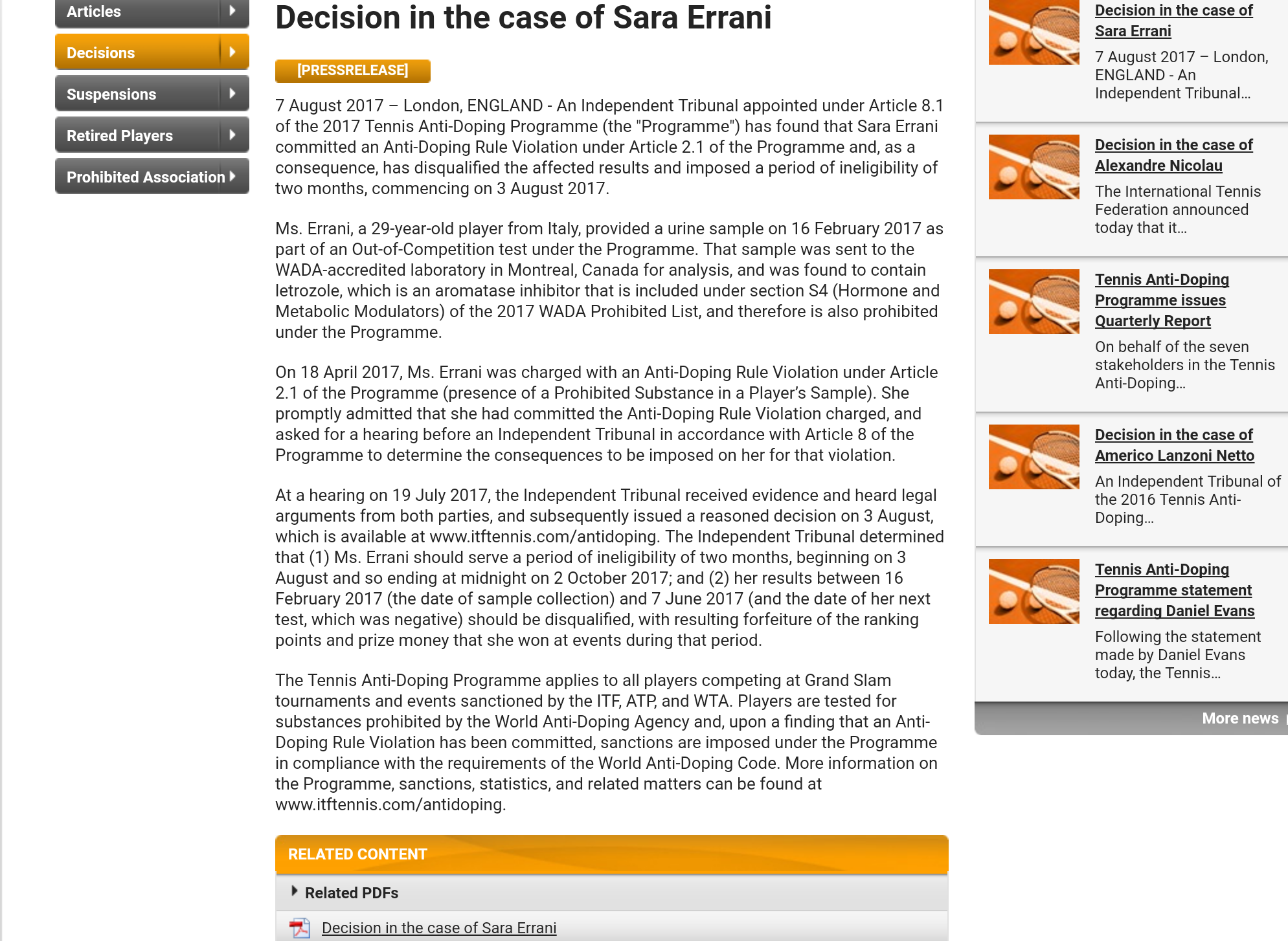 Errani si sarebbe anche sottoposta al controllo di un capello che ha escluso l’assunzione diretta del farmaco. All’udienza del 19 luglio il Tribunale Indipendente ha ricevuto le prove ed ha ascoltato le argomentazioni delle due parti e il 3 agosto ha deciso di squalificare la romagnola per 2 mesi e di toglierle i punti e i montepremi conquistati tra il 16 febbraio (giorno in cui Sara ha fornito un campione di urina al di fuori delle competizioni che è stato analizzato dal laboratorio Wada a Montreal che ha riscontrato la presenza di Letrozolo) e il 7 giugno (data in cui è risultata negativa ad un successivo test antidoping).