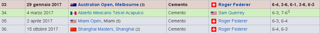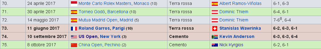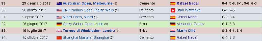 Basta vedere i titoli che ha vinto per capire che quella del 2017 è certamente la stagione migliore dello svizzero dal 2010 (quando aveva vinto un Australian Open – in finale contro Murray – e un titolo alle Atp Finals, contro Nadal) o addirittura dal 2009, quando aveva vinto Roland Garros – contro Soderling – e Wimbledon, contro Roddick). Per quanto riguarda il numero di titoli, se l’anno scorso non ne aveva vinto nemmeno uno, anche nel 2015 ne aveva conquistati 6, ma tutti minori a parte Cincinnati.