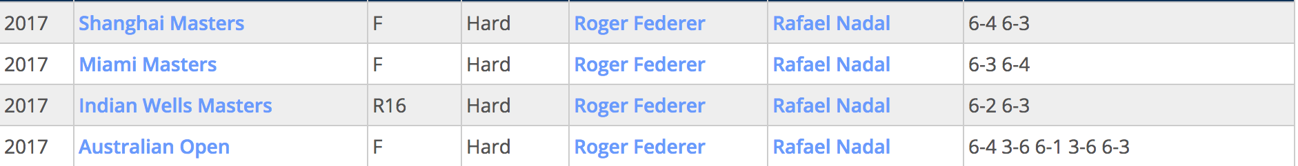 Se analizziamo gli scontri diretti del 2017, non c’è partita. Federer domina con 4 vittorie a 0 su altrettanti match, giocati tutti sul cemento: