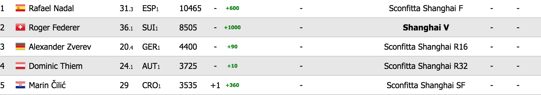 Ho scelto di mettere lo screen della top-five, per capire quanto sia siderale la distanza fra Rafa e Roger e il n. 3 del mondo Zverev, che ha poco più della metà dei punti dell’elvetico. Come si può capire, è molto difficile che Federer possa superare lo spagnolo entro fine anno, perché il divario è di quasi 2mila punti (esattamente 1.960). Consideriamo il fatto che è vero che Federer non ha nessun punto da difendere (l’ultimo suo match del 2016 era stata la semifinale persa contro Milos Raonic a Wimbledon), ma la stessa cosa vale per Nadal, che l’anno scorso aveva chiuso la stagione proprio a Shanghai, dove era stato eliminato all’esordio da Troicki. Per far sì che ciò avvenga Federer dovrebbe vincere tutto e Nadal dovrebbe fare molto male, cosa alquanto improbabile visto il suo stato di forma, anche se il cemento indoor è la superficie dove si trova peggio in assoluto.