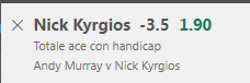 Il secondo pronostico è Kyrgios -3.5 (totale ace con handicap) a @1.90 su Bet365.