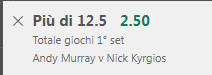 Quote moneyline piuttosto centrate, forse Kyrgios un pelo alto come apertura, ma tutto sommato se Murray ti batte Tsitsipas, devi rispettare questa vittoria.