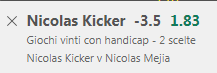 Il pronostico è perciò Kicker -3.5 giochi a quota @1.83 su Bet365.